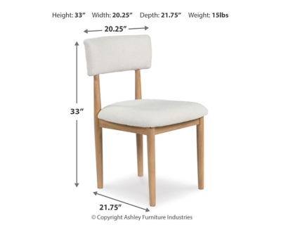 Casual lifestyle design with a modern vibe. Made with hardwood solids, decorative melamine laminate, and MDF substrates. Finished in a natural Oak color for a casually relaxed setting. D427-15 round dining table features a contrasting replicated white marble top. D427-02 upholstered dining chair made with solid wood frames with a cushioned seat and back rest covered in a white colored boucle fabric.